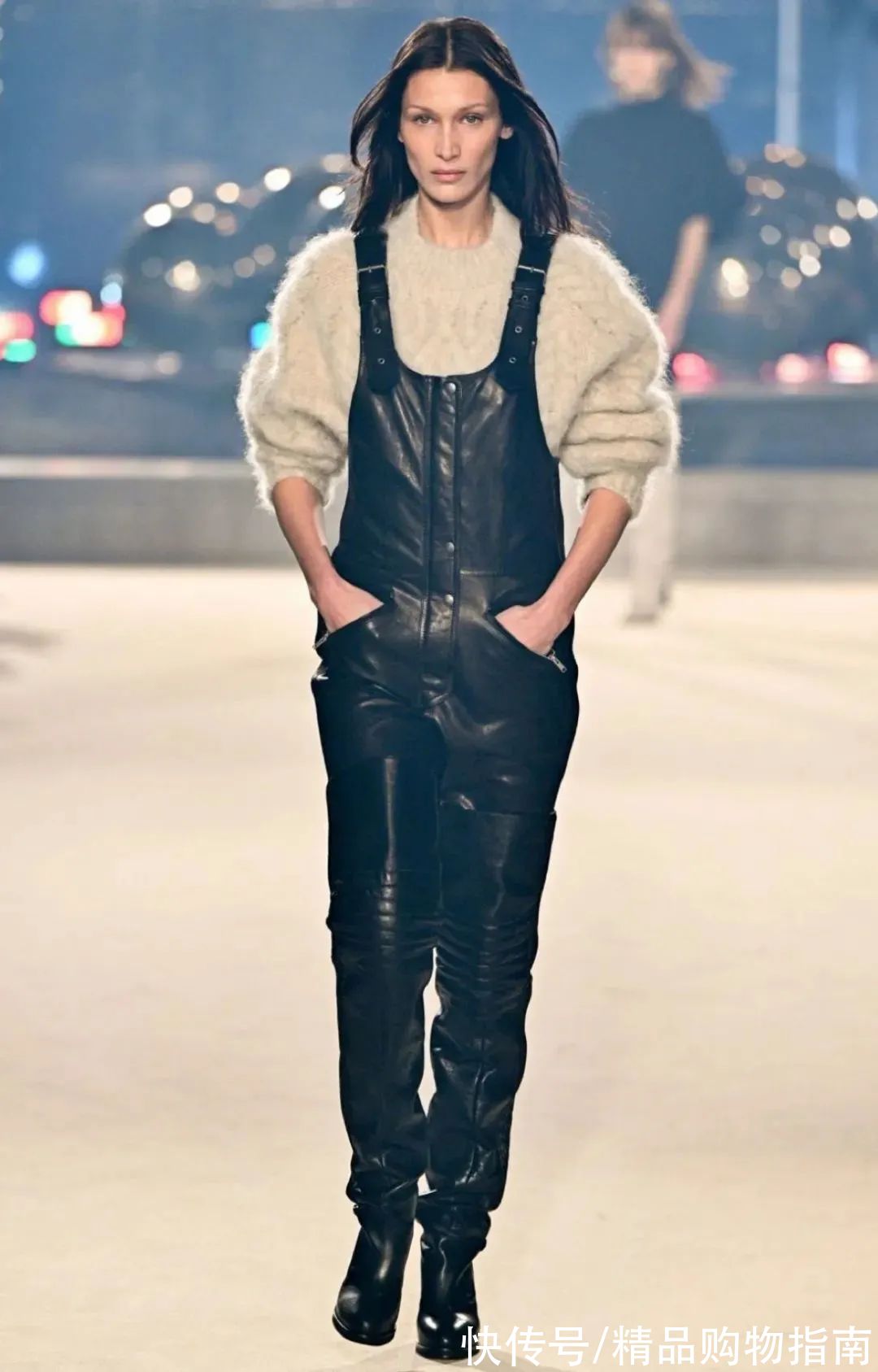 Isabel Marant FW22这套造型比起其他造型而言更加日常,皮质背带裤带有些中性的英气,而里面的毛衣则显得温暖温柔。