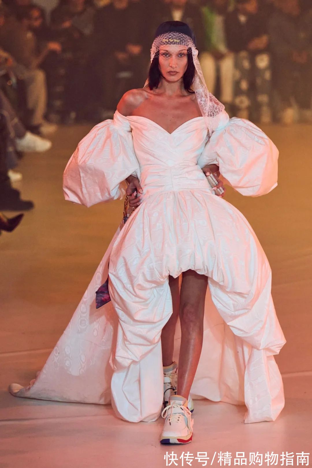 到了Off-White FW22 秀场上,她穿上Virgil Abloh最后设计的婚纱,摇身一变为梦幻柔美的新娘,泡泡袖与运动鞋的混搭,挑战传统新娘形象。