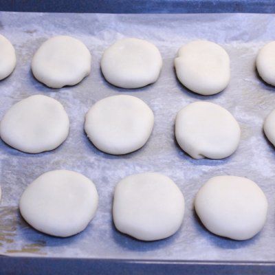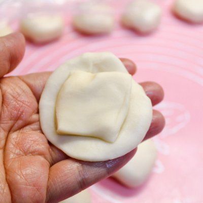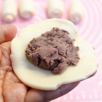 10、取1个剂子从中间按一下对折,擀成皮包上无糖红豆馅,收口后按扁;