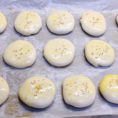 12、表面刷蛋黄后,用刀片划三个口子,再撒上芝麻;