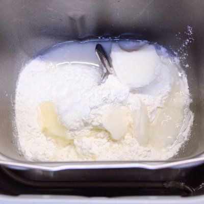 2、制作水油皮:将低筋面粉150克、猪油50克、糖15克、温水65克放入面包桶,开启揉面模式,和成光滑的面团;