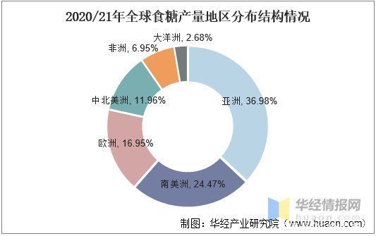 从全球食糖产量地区分布情况来看,2020/21年全球食糖产量最多的地区为亚洲,占全球总产量的36.98%;其次为南美洲,占比为24.47%。