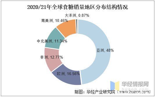 从全球食糖销量地区分布情况来看,2020/21年全球食糖销量最多的地区为亚洲,占全球销量的48%;其次为欧洲,占比为16.56%。